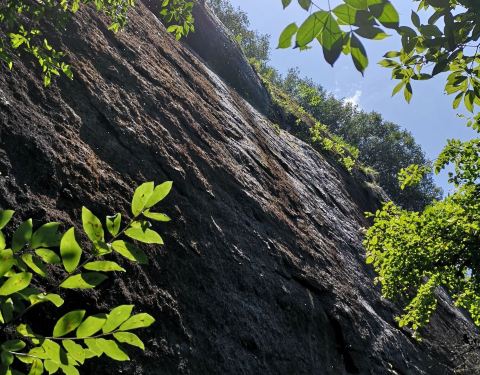 从景区入口处到一线天步行差不多五到十分钟,途中树木葱葱,树荫遮阳,看到随风波动的树叶下也随之摇曳的阳光,忍不住去踩踏,我想这会是小猫咪最喜欢的游戏。