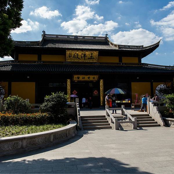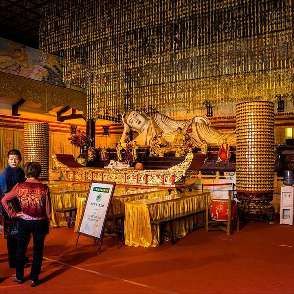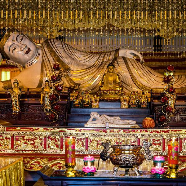 释迦牟尼涅槃像由名贵的缅甸白玉精雕细琢而成。白玉毛料1999年在缅甸发现,历经三年艰苦开采,始现于世。 该玉料为一块完整一体的纯天然玉料。据玉材的天然造型,经过精心设计,由德纯艺高的工匠历两年时间精工雕成。玉佛精美华贵,庄严殊胜,玉清底白。佛像长8.9米,高2.45米,总宽1.35米,体型比例均确,栩栩如生而自有灵气。玉佛全身镶嵌有1500多粒红、蓝、紫晶宝石和翡翠,衣纹和莲花台由24K黄金镏金而成,彩绘部分采用天然石色彩画而成:如白色、红色、蓝色分别由白海螺、红珊瑚,绿松石研磨制成。 该玉佛2004年10月被纳入上海大世界吉尼斯之最,是世界第一大玉卧佛造像,弥足珍贵。