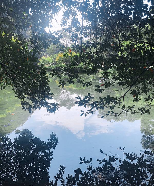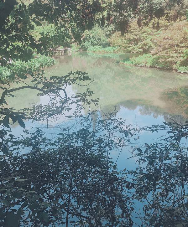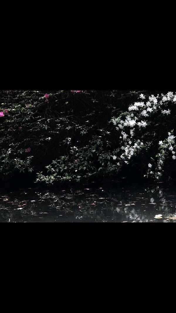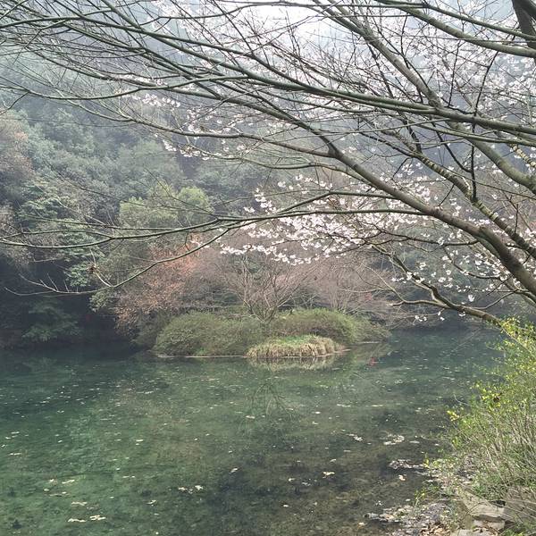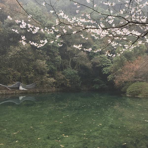 排除水面上飘浮的树叶,水是算清的,没有阳光的辅助下也呈现剔透的翡翠色,有几颗花树落英缤纷,真遗憾天公不作美,不然画面要美很多。