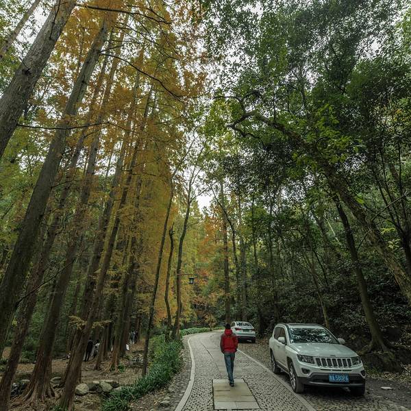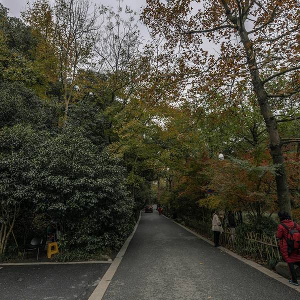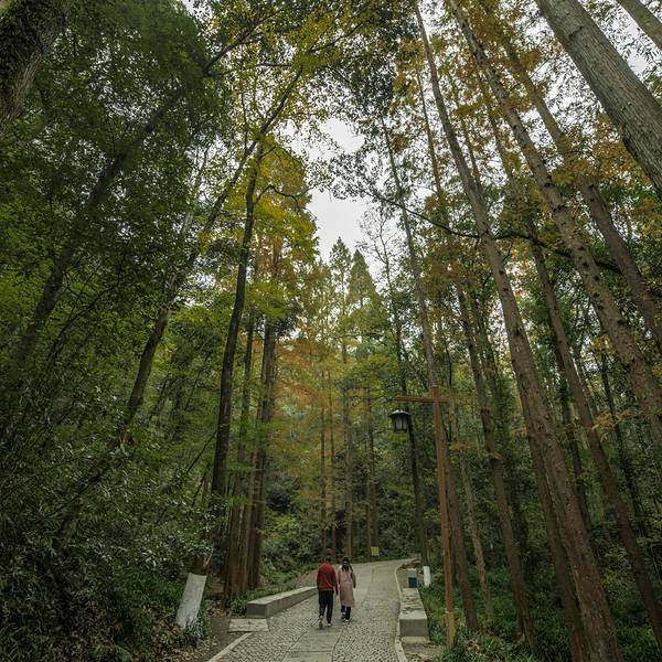 今年的冬季来的有些晚,路旁高高耸立的树叶也刚刚黄了起来。一边绿色一边黄色的树叶,从视觉上就给人一种美好的享受。呼吸着新鲜的空气,享受着大自然的原生态,这样的徒步环境质量堪称国内前列。如果喜欢这里的话,建议从杨梅岭村一路徒步过来到理安寺再到九溪烟树,然后再返回。
