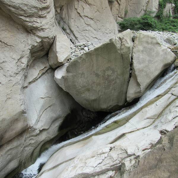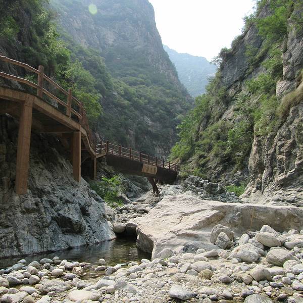 仙峪又名车箱谷,在华山峪西, 仙峪深五十余里,峪道窄狭清幽,山路崎岖蜿蜒,河流湍急,山石险峻,多处路段凿崖加栈凌空通过。进峪五里处,有斜岭横阻,令人有谷尽路绝之感,然越岭横度,又不能不平添一种柳暗花明的情趣。