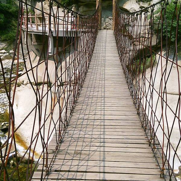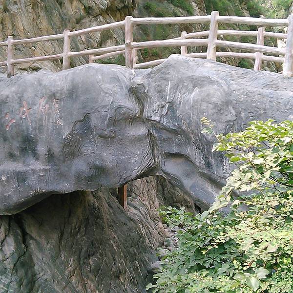 没事,马上就凉快了,抱着这种想法,我们4个往前走。与华山不同,这里的道路非常好走,一路都是沿着山峰走向修建的栈道,基本是平的,偶有台阶和桥,路面非常干净,果皮纸屑根本看不到,就连垃圾箱也不多。桥下小溪流水潺潺,头顶艳阳高照。走了一个小时,发现一直都是重复,无非是从这个山峰的栈道走到头,跨过桥,连上那个栈道接着走,一直是这样循环,此时算是明白了,仙域就是一个大峡谷。如果仅仅如此也就算了,问题是太阳还直晒。虽然同是大峡谷,但与张家界大峡谷的气温会比山外低上好几度,树木长的十分茂盛,树枝向外肆意伸展,形成树荫。这里的树木十分稀疏,别说形成树荫了,连岩石都覆盖不了,所以整个山头像是鬼剃头般,这一块突,那一块裸露。然后我们4个傻兮兮、惨兮兮得又走了一个小时,一路上乘凉的地方都很少,卖东西的小摊贩都没有,出了一身汗,幸好我是下了火车直接买票来玩,一直背着包,有些干粮,可以分给大家,要不我们那天真的会半途而废。