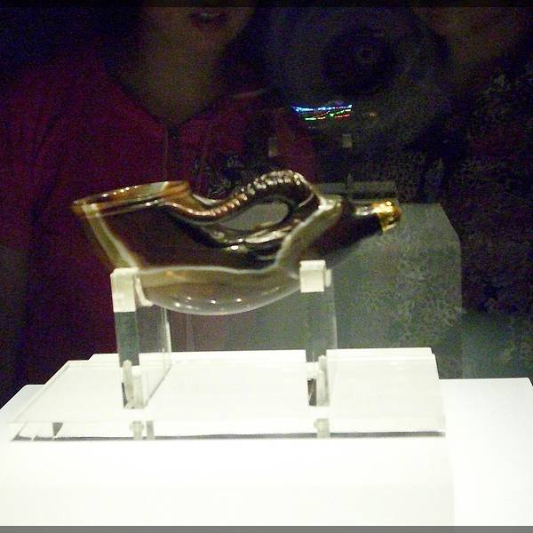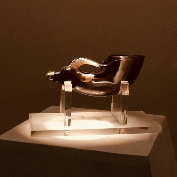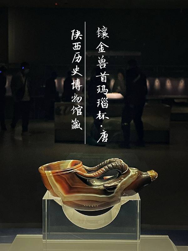 ✨镶金兽首玛瑙杯:由一块五彩玛瑙刻制,杯体呈兽角形,杯前部雕刻牛形兽首