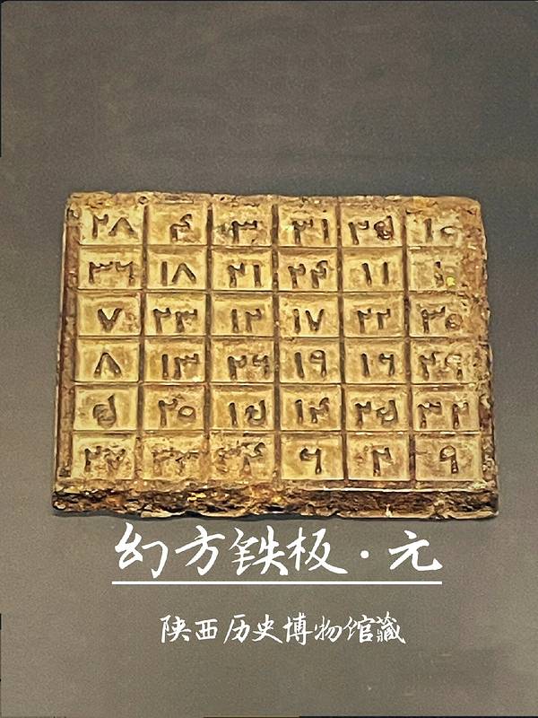 国宝厅现在展示的是杜虎符。常设展厅补漏了一些。比如元朝的幻方铁板,在陕历博众多精美华贵的文物中并不起眼,却展示了八百年前古人对数学知识的认知,特别神奇。顺便提一句,这才是真正的阿拉伯数字。傻眼了吧?不认识吧?😂。