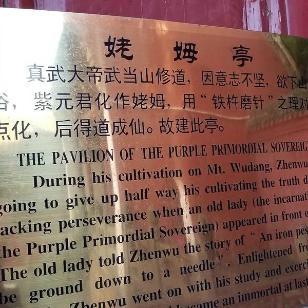 ...大巴,跟司机说我要在磨针井下,这是一处很冷门的景点,你不说的话司机是不会停车的,直接拉你下山了从琼台坐摆渡大巴到太子坡后转从下山的大巴,跟司机说我要在磨针井下,这是一处很冷门的景点,你不说的话司机是不会停车的,直接拉你下山了。大家一定听过“只要功夫深,铁杵也能磨成针”的话。相传当年净乐园太...从琼台坐摆渡大巴到太子坡后转从下山的大巴,跟司机说我要在磨针井下,这是一处很冷门的景点,你不说的话司机是不会停车的,直接拉你下山了。大家一定听过“只要功夫深,铁杵也能磨成针”的话。相传当年净乐园太子真武来此修道,起初因意志不坚,欲下山返俗,行至此,遇一老妇在井旁磨铁杵,甚感好奇,问其何为?老妇答道:欲磨成针。真武不解如此粗的铁杵如何磨成细针,老妇乘此点化道:“铁杵磨细针,功到自然成。”太子听后顿悟,遂返身上山,重新修炼,最后终于得道升天成为“真武大帝”,磨针井也因此而得名。到半路磨针井下车再走30米就到了里面的祖师殿前现在埋着两根碗口粗的“铁针”,象征老母当年所磨铁杵。殿旁亭中有井,井台下,至今保存一石碑——“直角兽”化石,据考证,它距今已有2亿多年的历史。整个地方我只碰到一个人在此游览,可见真是冷门得可以。铁棒磨成针的典故就出自这里。浏览了半个多小时又回到路口等大巴车下山。 展开