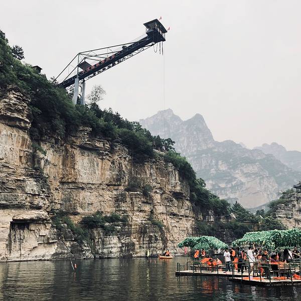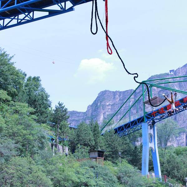 3:撞钟亭、情人台、月老石:一条直线上山的我们没有去石佛馆通过这个流淌着山泉的台阶上到山的一半用零钱试一下运气,看看是否可以扔到麒麟山石碑下月老石屹立在山间山上的野蝴蝶撞钟亭鬼屋、演出、这两项我们觉着没有意思,所以没去看,其实山上均为看风景,山中间则是蹦极台,山下是竹筏这些水上项目。坐着下行索道缆车去蹦极拍张照片纪念一下。4:其实站在蹦极台上,谁都不例外的会害怕,也无法平复那种紧张的心情。教练会让你将双脚超过站台一半,这样你可以张开双臂,向前一倾,身体将坠入空中,接着是回弹几次,会有一点点怕,可以喊几声壮壮胆,哈哈,然后水面上的救生员会将一根软管伸向你告诉你抓住,顺利的将自己平放在船上后解开脚上的绑带,害怕的朋友可以在船上稍躺缓缓,然后有快艇接着回到岸边去看自己的照片和视频了。