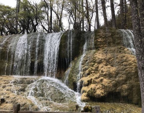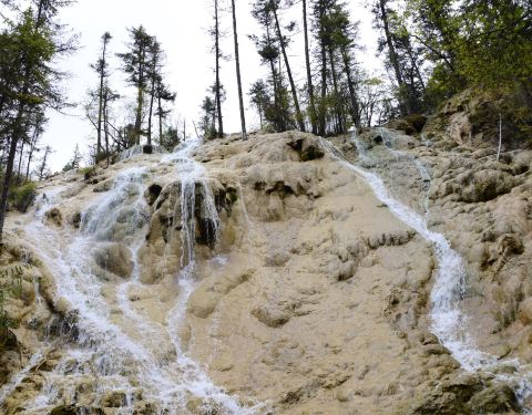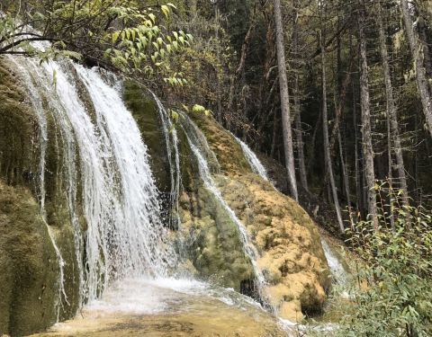 ...态,有苔藓地貌、钙化瀑布、原始森林和石林,尤其钙化瀑布非常壮观,秋天红叶彩林五彩斑谰,景色迷人