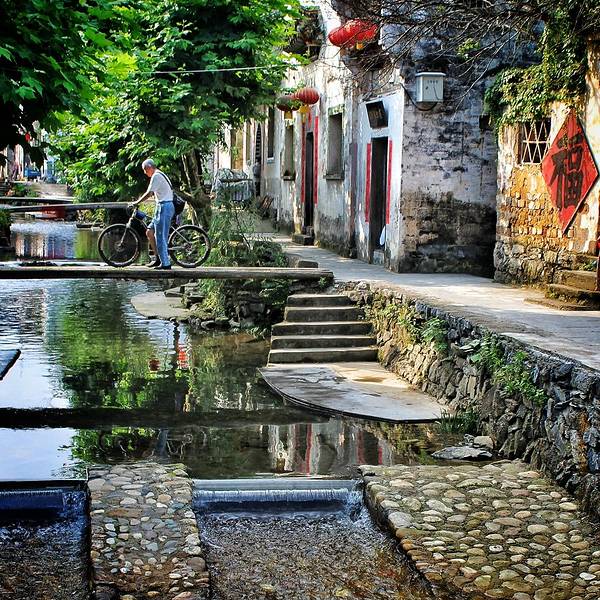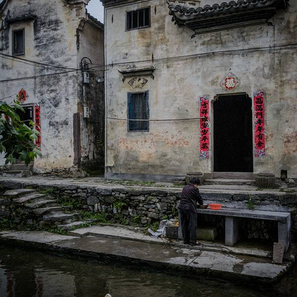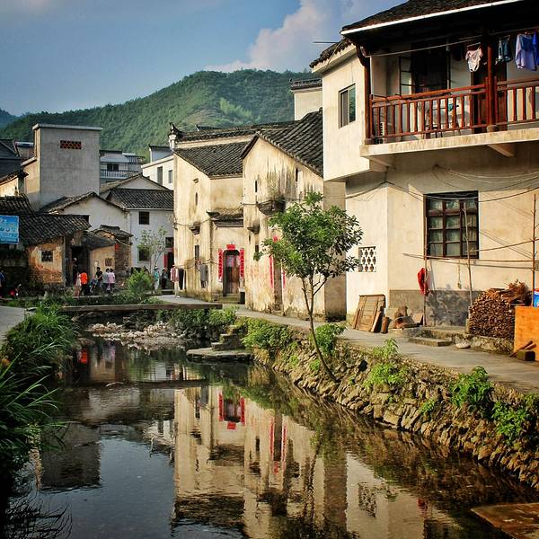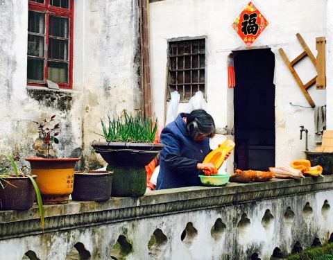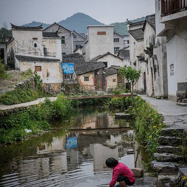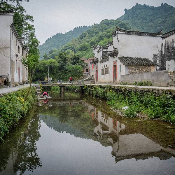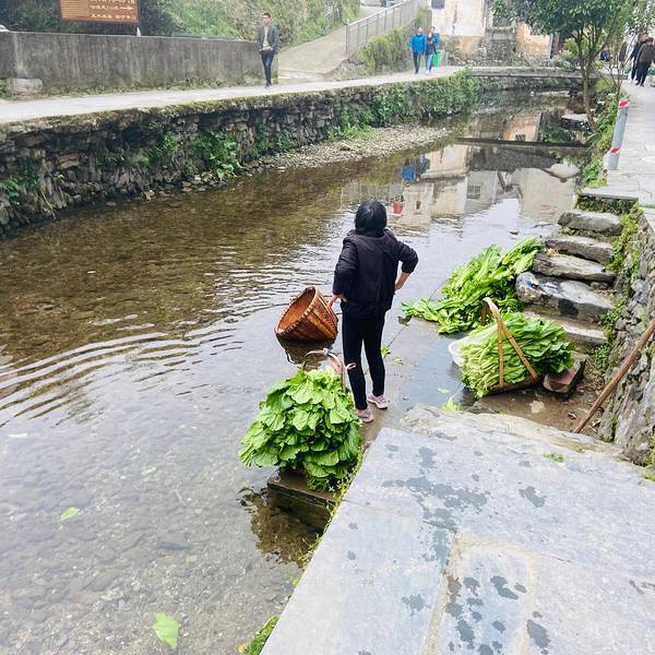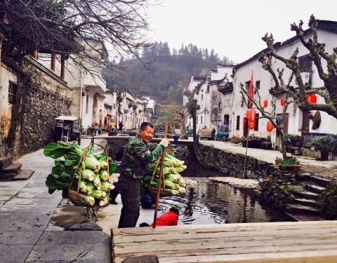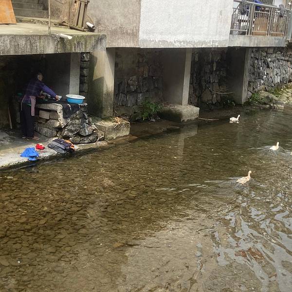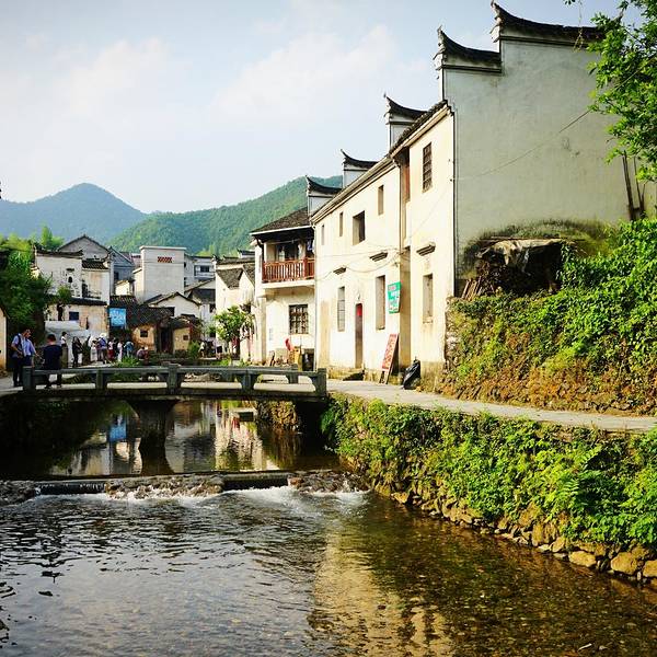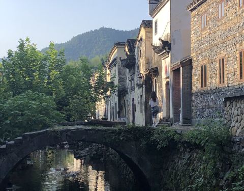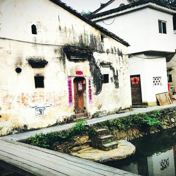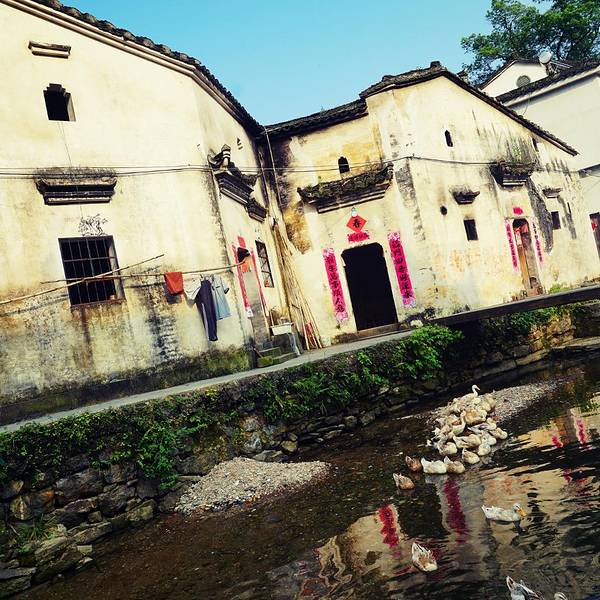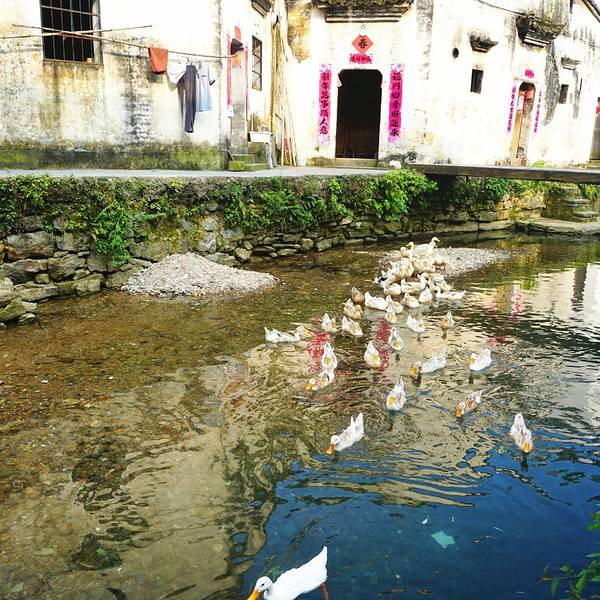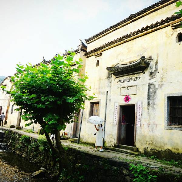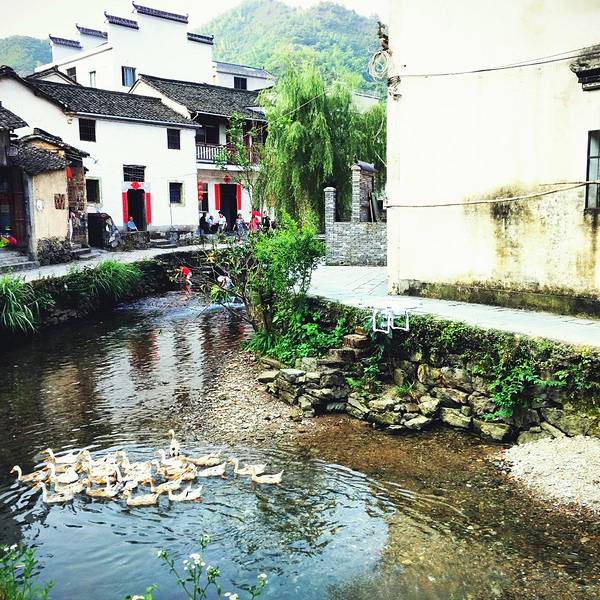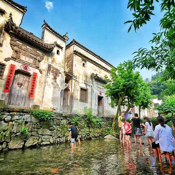 村里道路有些狭窄,只能通过自行车和三轮车,私家车都停在外面,然后顺着溪流的方向,徒步进村.这里有着小桥流水人家的原生态的环境,一公里多的小溪蜿蜒流过整个村落,溪水清澈见底,能看出水质很好。小溪水流湍急还有小瀑布,很清凉的水石板小桥连接着左右两边的住宅,黑瓦白墙的徽派建筑,很多都是明清时代建的老房子,门檐上都有砖雕,雕刻的人物栩栩如生。阳光洒下来,好漂亮的色彩~初夏,当地居民在小河边上淘米、洗菜、洗衣服,小孩们在溪边嬉水,猫猫狗狗在屋檐下睡觉,一派祥和景象。最开心的是看到了一群大白鸭在水中觅食,在城市里很难见到的可爱动物,让游客一阵惊喜,好想下水和他们一起玩耍。