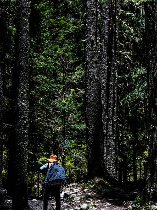 到长坪沟已经将近十点,取了票,乘坐观光车到景区门口,开始今天的徒步旅行。长坪沟有7公里栈道,栈道之后全是泥路。原计划我们是要到木骡子的,后来发现时间不够,就只走到原始森林就回来了。
