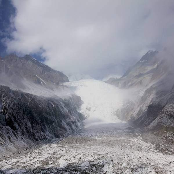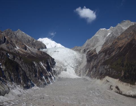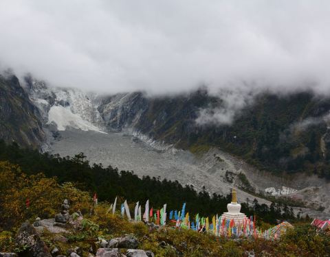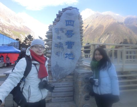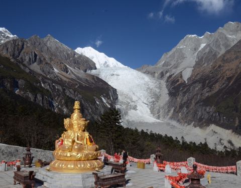 四号营地,主要可以看到落差达到1100米的冰瀑,瞭望海拔7000多米的贡嘎主峰,还可以与冰川来一次亲密接触。此外还有2个小景点,一座由泰国公主捐资修建的四面佛,一座小的藏佛寺,这些寺庙和佛塔在白雪皑皑的冰雪之上,能感受到有另外一种神圣的美丽。