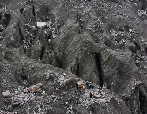 主要说说爬冰川是一个什么经历,人一辈子难得有机会亲身爬冰川,让我哭着爬着也要爬过去!下冰川是一个很艰辛的故事:一开始下冰川,虽然我穿了冰爪,但是在南方的小孩,来到冰天雪地一直打滑,几乎是连滚带爬滚下去的。下冰川一开始还有楼梯和小路;但是要到冰川中间去是根本没有平路可走,而且有很多很大的冰缝,一不留神就会有危险,吓死本本宝宝了,不过也可能是因为我有点怕死。我估计这个状态是无法到冰川中心的了,几乎是要靠摸滚爬翻越过去。有挑夫过来游说我说给钱扶我过去,收费有点贵,50元产妇我下冰川,大约150米的路程。几经挣扎,想到冰川就在面前了,我的爬行速度天黑都爬不过去,最后成交了,挑夫很利落,带着我10分钟就过去了。