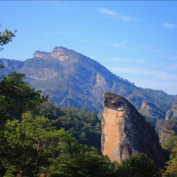 景观独特震撼,是天然的地质课堂。鹰嘴岩是武夷山最具象形的丹霞巨石之一,整座山体浑然天成,岩顶前突如钩、形似雄鹰昂首振翅,形态逼真、气势雄浑,堪称大自然的鬼斧神工。岩石顶端还生长着一株古柏,千年挺立,为“石鹰”增添灵气,孩子远远望见便会被其外形吸引,惊叹不断。沿途岩壁纹理粗犷、层理清晰,能直观看到丹霞地貌形成痕迹,搭配家长简单讲解,便是一堂生动有趣的户外地理课,让孩子在游玩中增长见识、开阔眼界。