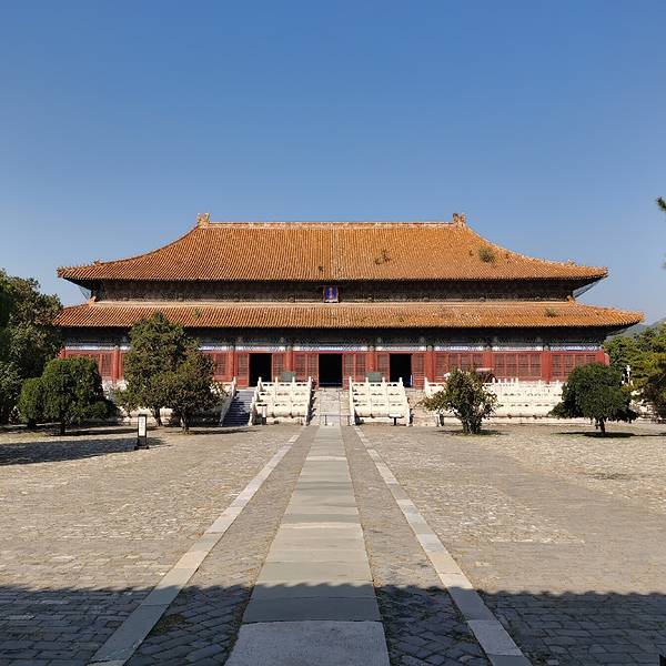 明长陵前面的方形部分,由前后相连的三进院...地铁昌平线昌平站 (C口出) 下车,步行至昌平鼓楼南街北口站乘坐昌55路,在献陵村站下车,再步行200多米到长陵。