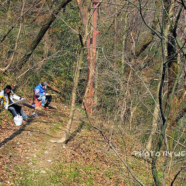 这是许多登山人第一次休息的所在。两位画家正坐在道边写生,而他们自己也正嵌入了这幅美丽的画卷之中离开四道士塔,逐渐开始向上攀爬的路程,山势也渐渐陡峭起来。