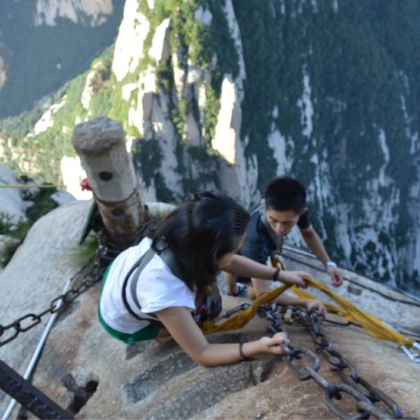 多少年来,有无数游客想征服长空栈道,而到了此处以后很多都已经放弃了,它的危险和惊险程度在全世界都可以排上名次,也让华山成为世界上最危险的山峰之一。被世人称为奇险天下第一山。长空栈道是不要门票的,门票包含在华山门票以内,华山门票学生票90元。但是安全绳索是需要费用的,收费为30元一人。长空栈道上有专门拍照的,收费为50元一人,如果想留念的话,可以找别人帮忙拍,自己拍的话可能手机会掉下去哦。长空栈道一共分为三个部分,一段是顺着铁架爬下去,中间一段是过木头做的悬空栈道,最后一段是攀爬石头缝。最后到达目的地,长空栈道的尽头是一个小型寺庙,听说是真人修炼的地方。寺庙本身没有什么看的,目的只是为了体验一下长空栈道的惊险。
