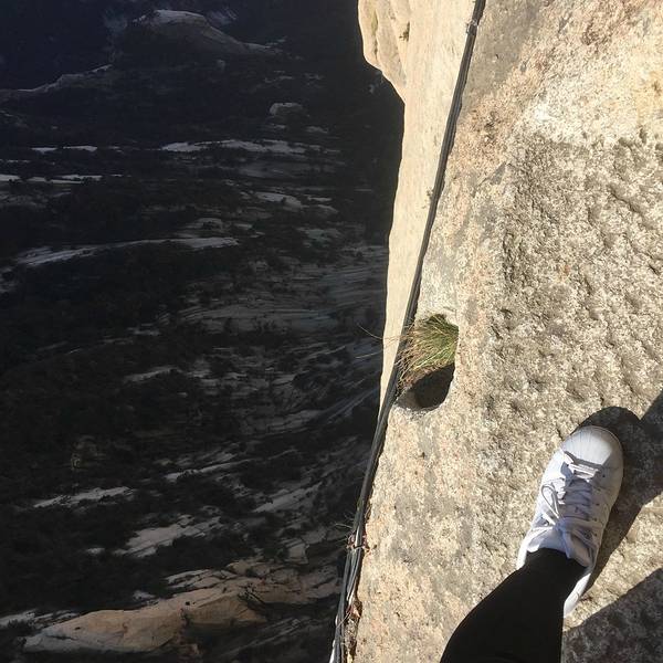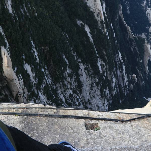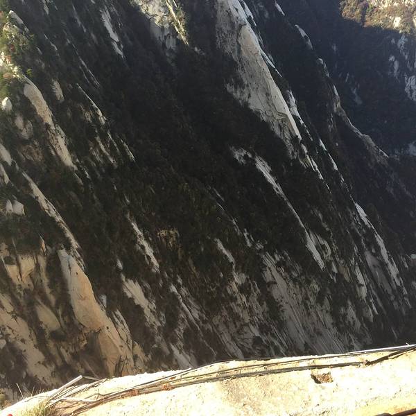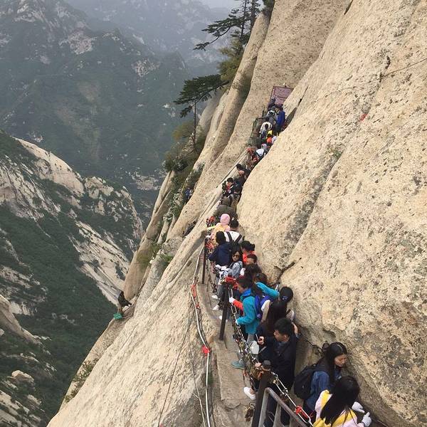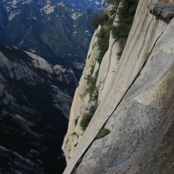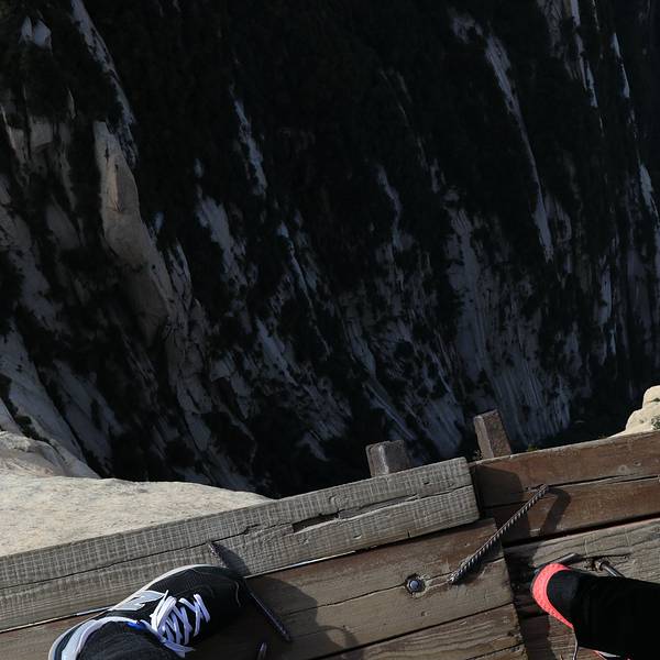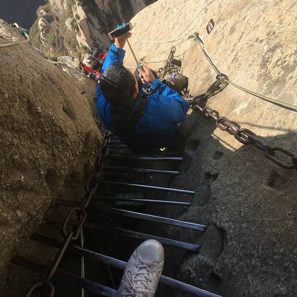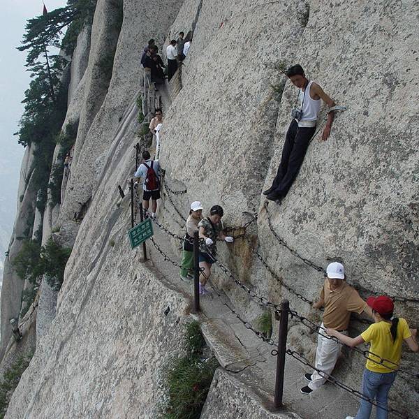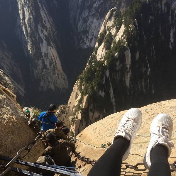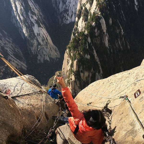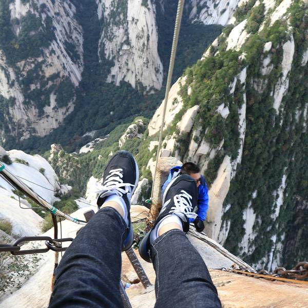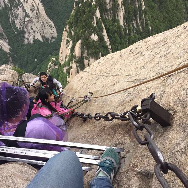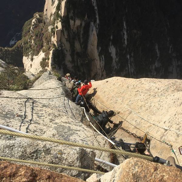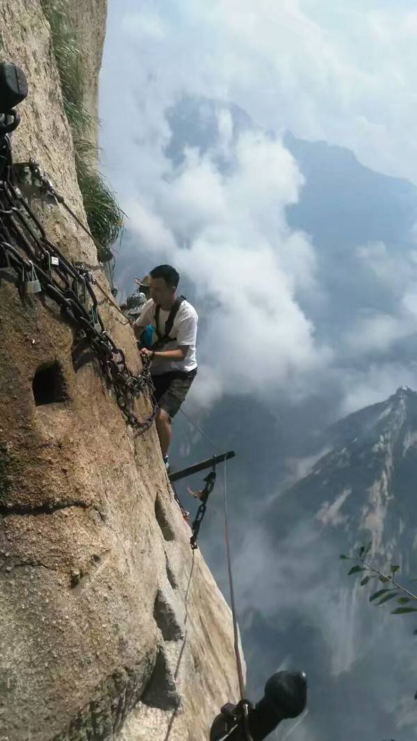 沿着岩壁上半脚掌宽的几格长石阶走两三米,就来到了真正的长空栈道。要是真的在悬崖上抽筋是怎样的体验呢华山之旅最害怕最期待的地方!明知道自己恐高,但还是要去受虐!