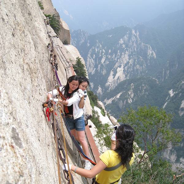 实用 四周视野极壮阔,空谷浩荡,但脚下是万丈深渊,人的感觉是几乎凌空,注意:有恐高症的人绝对不能来哦南峰海拔有2160米,是华山最高峰,有华山最险的长空栈道。所谓长空栈道就是在石壁上用铁钎插入石中,上面铺木板,仿佛古代的栈道,木板下就是万丈深渊。和鹞子翻身比起来,这里的攀爬也许并没那么费力,但对心...南峰海拔有2160米,是华山最高峰,有华山最险的长空栈道。所谓长空栈道就是在石壁上用铁钎插入石中,上面铺木板,仿佛古代的栈道,木板下就是万丈深渊。和鹞子翻身比起来,这里的攀爬也许并没那么费力,但对心理考验却极大。听说华山每年都有在此丧生的游客,所以现在加了安全保护措施,身上系安全带扣在绳索上,这样即使失足,也可避免掉下去,但必须要严格按照工作人员交待的步骤去做。每人收费30元。从这里走到头后必须垂直往下,身后就是万丈深渊,行走必须全神贯注,小心。踩着这“路”垂直往下约十来米才能走到横着的木板栈道上去。背后是万丈深渊。再三提醒自己千万不要往下看,一不小心还是看了一眼,那个险!四周视野极壮阔,空谷浩荡,但脚下是万丈深渊,人的感觉是几乎凌空,注意:有恐高症的人绝对不能来哦。我根本就不敢把相机拿出来。顺着石窝,一步步挪到下面拐弯的地方,居然还有个工作人员拿着一次成像的照相机招揽生意。挣钱都挣到这个地方来了,相当强悍!!因为紧张,我抓铁链的那只手感觉快要抽筋了,人就像一只壁虎贴着山崖徐徐平移。如果对面来人的话还必须进行空中换人。小心翼翼的挪到栈道尽头,别有洞天,一块三面悬崖的平台,石壁一个四方小洞,里面供个道人,不晓得是哪路神仙,旁边刻着三个苍劲大字:思过崖。不知道令狐冲关禁闭的思过崖是不是就是这里,但长空栈道的险峻与绝美,很当得起思过崖的地位。长空栈道不是必须要走的地方,所以胆小的游客可以选择不走长空栈道就是了,不影响去其他的景点。 展开