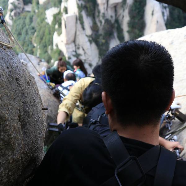 长空栈道并不在通往其它峰的主路上,而是在一条岔路上,如果时间紧、或者不适合这种危险性活动,不要勉强,很多人都是下到一半害怕的不行,又倒转回来,给彼此增添麻烦。走过那条岔路,回头就能看到远方的下棋亭,那里是鹞子翻身的终点,和鹞子翻身一样,长空栈道也需要走回头路,鹞子翻身是到下棋亭折返,长空栈道是到思过崖折返。过了一个仿古的门楼就是长空栈道排队的地方,在那个门楼里有商家提供PS服务,可以把你的图像P上长空栈道,不少想去又不敢的游客纷纷在此排队。出了那个门楼看看远远的人形队,我估算一下,估计得排1个小时了,后来实际用了3个小时。5月份时人不多,那次往返用了不到半个小时,国庆期间人太多了,而且长空栈道的路既险又窄,还要两队人马迎面走并排,一般一队10到20个人,一队下去,一队上来;这个队的人大部分上来后,新的队才能下走,之前下去的几只队此时也部分已变成了返程队,以此类推。不少人在等待时,听着刚出发的那些人的尖叫,看着那些人几乎不动的贴着悬崖壁上,已经打起退堂鼓。即使是排队等待的路,也不是很宽敞,我35的脚,脚尖贴着脚跟,路的宽度也不超过两脚距离,靠着2条铁链做安全防护措施,铁链外,就是2000多米深的山沟。10月份,在山上,没一点太阳,山上风还特大,那天晚上索道因风太大都暂停了,不少人买了一次性雨衣防风,而且很多是套了2层,好在我之前爬过,自备了羽绒服,当初打包行李时,同行的朋友还嘲笑我国庆节带着羽绒服旅游。交了30 ,工作人员发了安全绳索。安全绳索总共两个环,扣在悬崖两旁一节一节的安全绳上,两个环是不能同时离开安全绳,遇到安全绳的节点时,先取下一个环,挂到下一节安全绳上后,才能取下第二个环。出发之前工作人员会一再千叮咛万嘱咐,但是每年依然有人在此丧命。第一张图片是5月份,人比较少,只有单程,下来是,面朝万丈深渊,呈坐姿下;第二张图是国庆,人暴多,必须在这么窄的铁棍制的台阶上往返,返程时,面朝台阶。长空栈道我觉得最害怕时,其实就是在这里,而不是在栈道上。因为路又窄,又得走并排,给回来的人让路,而且面朝悬崖,安全绳还需要下两个台阶就要取下来,挂到另一节安全绳索上,总而言之,手脚都忙活。返程因为之前走过这段,而且马上结束,会轻松些。此时下方已经认为去程和回程的人在拐弯处撞车,而静止了半个小时,我有空掏出手机拍了两张,心情也平复一些,不那么紧张。到了拐弯处,就是凿在悬崖上一个一个的洞了,人不多时还能拍个照,如果人多,肯定是在这里堵车,因为洞的宽度并不大,勉强容下两个脚,有的甚至容不下,需要去程和回程的人配合好,经常能听到“你踩到我啦”之类的惊呼。在悬崖上90度转弯后,来到栈道。告诉大家一个窍门,如果不想一直和对面的人走并排,可以交20块钱照相,为了拍照效果,工作人员会先制止上面的人转弯,回程的人过来,此时你可以在这块不宽的木板上喘口气。其实在这里并不算害怕,只是去程的人贴着墙,回程的人贴着你,在这不宽又不短的木板上,一直被挤压着1个小时,真有种透不过气的感觉。栈道的尽头是思过崖,也就是风清扬传令狐冲独孤九剑的的地方,太多的人在上面挂铜锁,愣是把思遮盖成心。 展开
