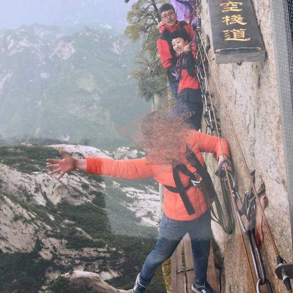 这是我认为最可怕的地方!沿着岩壁上半脚掌宽的几格长石阶走两三米,就来到了真正的长空栈道。栈道上有拍照的,50元一张,贵!后面的路我们没走完就返回了。