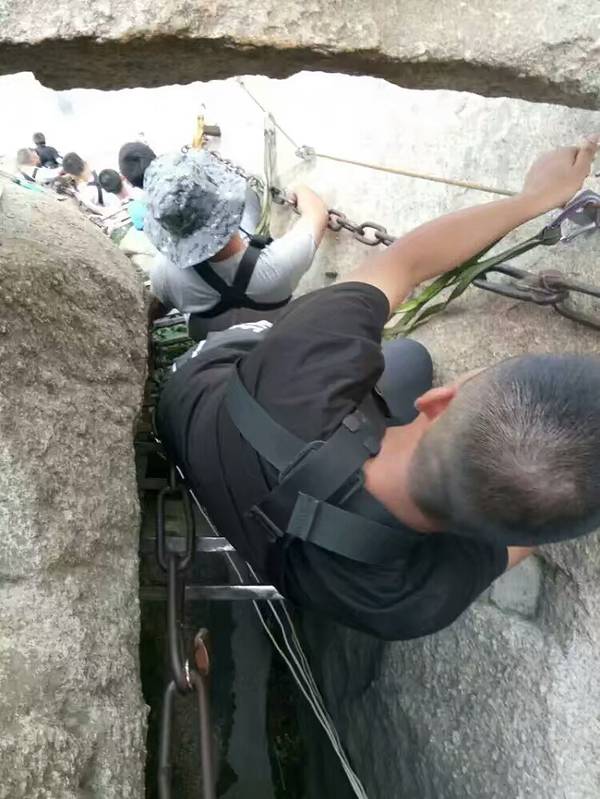 前面的老伯很牛逼,超越了他前面的小伙,还拿着自拍杆往后仰自拍,佩服的五体投地!现在看回这些照片真的觉得当时自己很了不起,简直用生命在拍照!石缝最底端有一石桩,高一米左右,被称为定心桩。给攀爬者定心用的。到下面几步还得用脚在岩壁上试探才找到落脚处,真是吓死宝宝了!最后两步我不知道旁边有石头可以踩,于是就直接跨下去,只有脚尖才能碰到落脚点,差点抽筋!要是真的在悬崖上抽筋是怎样的体验呢!
