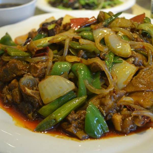 十几个人一起吃,没有大桌,用四张小桌拼起来。特别推荐手抓羊羔肉,肋排带骨头那种,非常好吃,没有膻味。清蒸羊羔肉是带汤的,也不错,但有点膻味。第一次吃炒糊饽,不知道是豆制品还是粮食做的,不过味道不错。辣炒鸡爪挺辣的,但是非常入味,酥软程度也刚刚好,是我吃过的鸡爪中很惊艳的了。