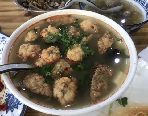 - 两个人点餐就要了青旅老板极力推荐的清蒸羊羔肉,一碗上来分量很足,满满的肉,但是我个人总觉得有股羊膻味