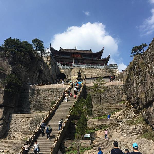 参拜完古拜经台之后,就是数百阶的台阶直入云霄,于泰山的十八盘有异曲同工之妙,石阶窄而高,经过几番努力,终于爬到九华山顶峰——天台寺,天台寺因地就势,布局奇巧,古朴和谐,浑然一体。东面以峰脊(青龙背)为屏障,南面以玉屏台为墙身,西面和北面以突兀的巨岩为连接点,在凹陷地上筑高8米的石台基,构成平整的平面。殿宇的底部架空,下置蓄水井。山门上镌有“中天世界”和“非人间”两方石刻。当你身处此地,真能感觉到自己心灵得以净化,极目远眺,不得不赞叹圣地治愈人心灵的能量之大,这种情景,语言确实难以描述。 展开