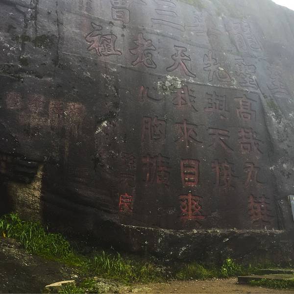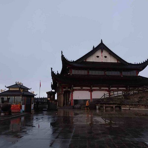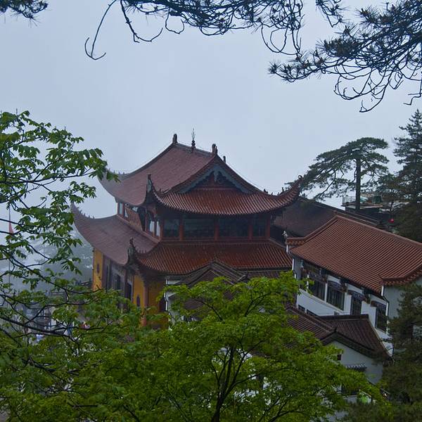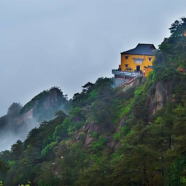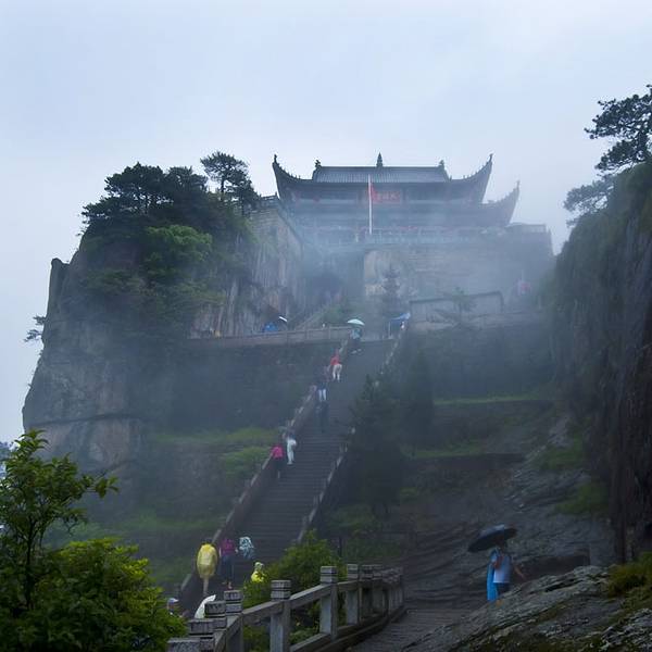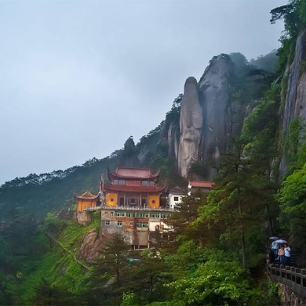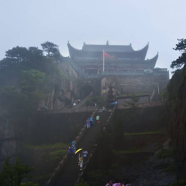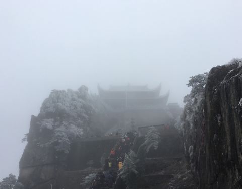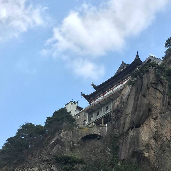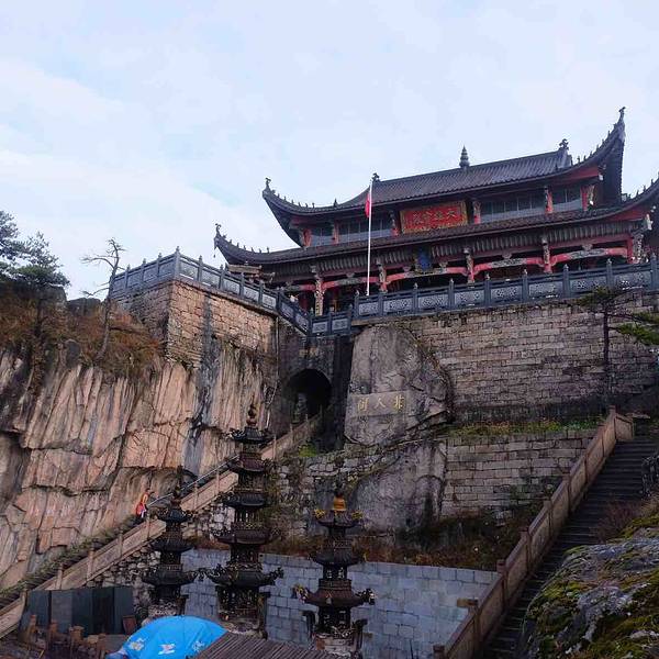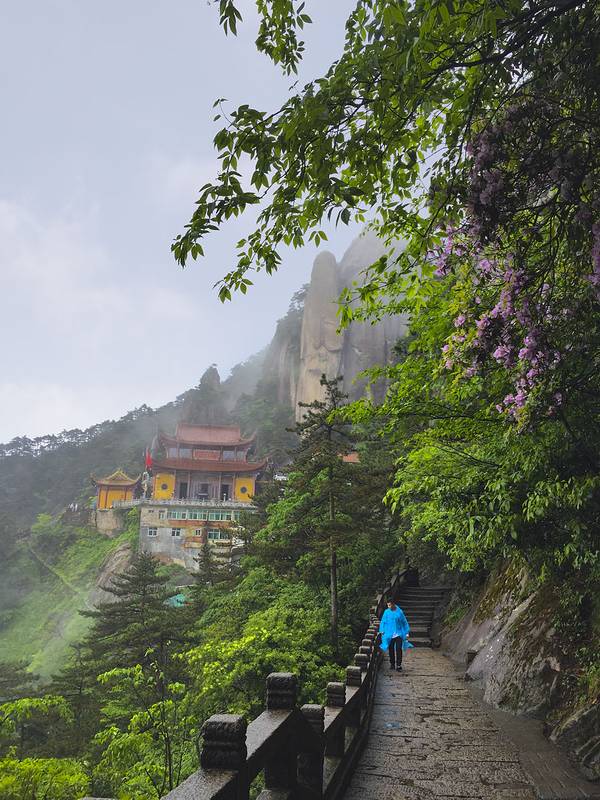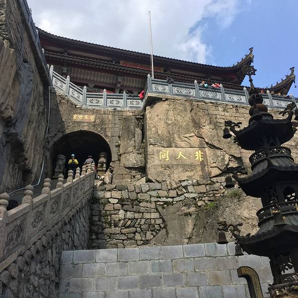 经典的九华山名片呈现在眼前,造型美观,翅角高耸,飞桅凌空,在漫天雾气中忽隐忽现,真是神仙圣地呀雾大且空间小,没有好机位。在这里花了35元买了个拐杖,便开始向上爬800多个台阶。由于昨天走的比较快,膝盖不适,今天慢慢走感觉还可以。本来想只要能远远看见天台寺,拍个照片就可以了,但沿着拐来拐去的台阶上...雾大且空间小,没有好机位。在这里花了35元买了个拐杖,便开始向上爬800多个台阶。由于昨天走的比较快,膝盖不适,今天慢慢走感觉还可以。本来想只要能远远看见天台寺,拍个照片就可以了,但沿着拐来拐去的台阶上来,等看见天台寺时已是没有多长台阶了,便一鼓作气地上来了。今天走得慢,虽然台阶远比昨天的多,但膝盖并没有昨天那么难受,看来以后一定注意让自己的脚步慢下来,才可走得更远。经典的九华山名片呈现在眼前,造型美观,翅角高耸,飞桅凌空,在漫天雾气中忽隐忽现,真是神仙圣地呀!至寺前回首一看,左有龙头峰,右有龙珠峰,对面十王峰。 寺前岩壁上有“非人间”等巨字摩崖石刻。寺门在龙头峰、龙珠峰间的渡仙桥下,由桥底登石阶十余步,即进入寺内。拱形桥上的横梁镌“中天世界”4个大字。