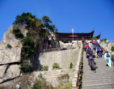 天台寺位于九华山风景区天台峰的山顶,是九华山地理位置很高的寺院,几乎所有到九华山的游客多会到访天台寺位于九华山风景区天台峰的山顶,是九华山地理位置很高的寺院,几乎所有到九华山的游客多会到访。天台寺历史悠久,初建于唐代,后经多次重建,目前的寺院是近代在清代建筑的基础上改建而成。乘坐缆车可以节...天台寺位于九华山风景区天台峰的山顶,是九华山地理位置很高的寺院,几乎所有到九华山的游客多会到访。天台寺历史悠久,初建于唐代,后经多次重建,目前的寺院是近代在清代建筑的基础上改建而成。乘坐缆车可以节省相当大的体力和时间,不过最后一段通向峰顶天台寺的陡峭石阶,是没有现代化工具可以代步的,必须自己徒步攀登,同时还需手扶石阶两边的栏杆,以防意外。天台峰顶的面积不大,天台寺的大雄宝殿即修筑于上山台阶终点的基座上,大雄宝殿的四周修有石质栏杆,凭栏可以远眺九华山诸峰,令人心旷神怡。 展开