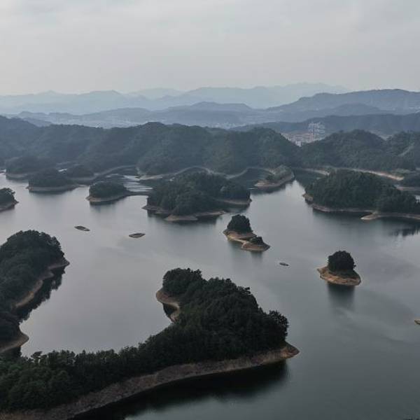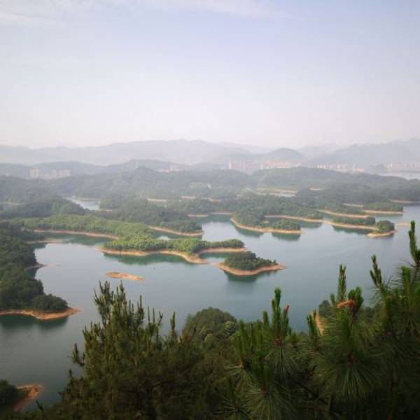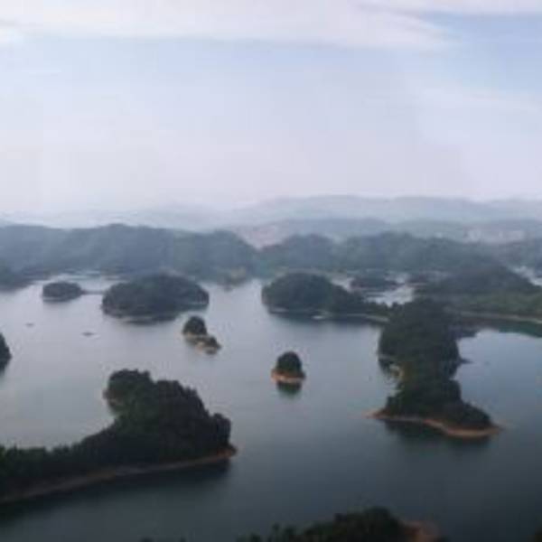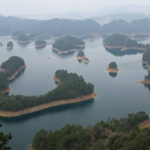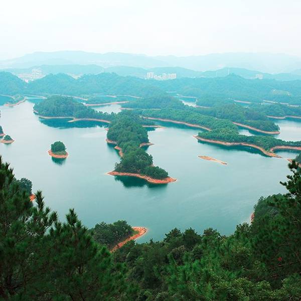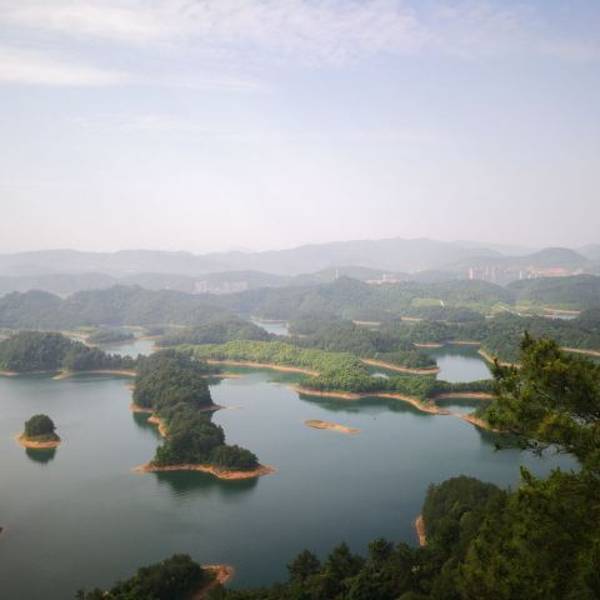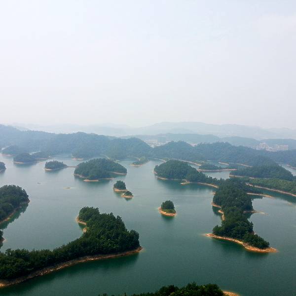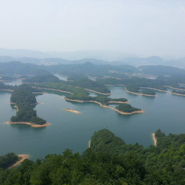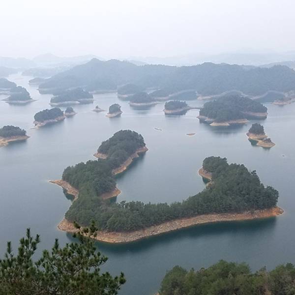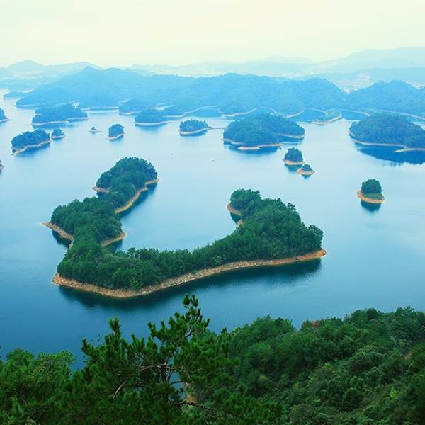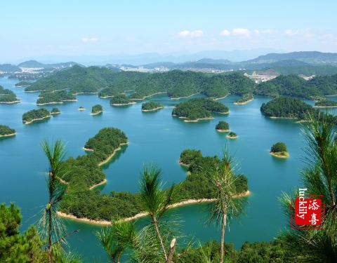 在黄山尖登临山巅,向西北俯瞰,九十多个岛屿尽收眼底,如一串串珍珠撒落在湖面;