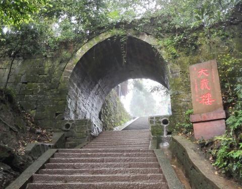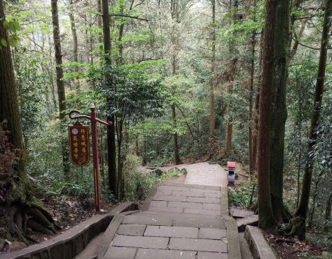 因为我们时间有限,所以在万年寺这个中转站选择走下行路线,就是清音阁,一线天,我们一行几人跟随导游在万年寺往下走,中途遇到一座寺庙,导游说这个是白龙洞,相传是白素贞当年修行的山洞,这一说法引起了我的好奇心,导游说寺庙不大,让我们自己进去参观,不收门票,一进大门,果然寺庙很小,一个殿供奉西方三圣,一个殿供奉华严三圣,虽说寺庙小,但是值得一提的是大雄宝殿内供奉着一尊南宋时期的观音像,这也正体现出来庙小神通大这句话吧。寺庙整体的建筑风格并没有什么特别的地方,中规中矩,香火也很一般。院子左右两边分别种着一棵有活化石之城称的桫椤树,第一次亲眼见到这种树,我还是很兴奋的,以前只在电影里见过这种树,据说是与恐龙同时代的,不过一棵很旺盛,另一棵明显偏黄了。听说有一个山洞,那里才是白素贞当年修行的洞,但是导游告诉我们,那个洞已经封堵住了,参观不了,想想看不到了我还是很可惜的。白龙洞寺庙外有很多卖当地特产,小吃的商贩,煮的腊肠比较好吃,四川特色味道,价钱不贵10元钱一根,还有卖一些纪念品的,可以使劲砍价的哦。寺庙周边没有饭店,没有住的地方,都需要下山才有。白龙洞往上就是万年寺,往下就是清音阁一线天,山路还比较平缓。建议游玩时间20分钟够了吧。