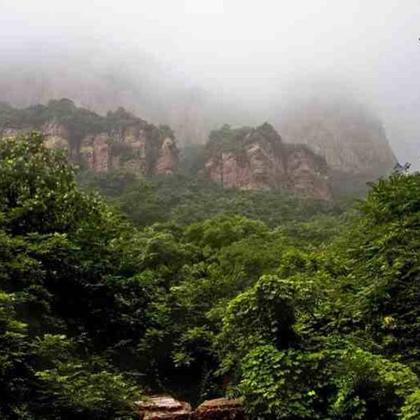 神农谷景区位于黄丹寺景区和鸡峰山景区之间,神 农河从景区穿过。沟内重峦叠嶂,峭壁对峙,树木葱郁,溪水长流,群山万壑之间,云蒸霞蔚,气象万千。 在此景区有渡仙侨、花雨丝路、济公峰、高崖飞瀑、漫滩等景点。 渡仙桥 位于黄丹寺以南2公里处,是黄丹寺景区 进入神农谷景区的必经之路。过去为简易的木头便桥,现建为石拱桥。相传,“陈宝”化为美丽风流的陈宝夫人,每年的鸡峰山庙会六月初六晚,与从河南南阳来的县令叶君在此幽会。故后世人把这座桥叫“渡仙桥” 站在这里,向东南方向望去,可以看到“玉笋排空”的鸡峰;向西南方向望去,可以看到直插云霄的天台山的莲花峰、天柱峰、人头峰和寄马峰。不愿上山的人, 可在此处远观天台山、鸡峰山,照像留影。 花雨丝路 位于渡仙桥之右侧,为二块自然形成的石柱构成。石柱约有丈余高,粗二抱合。从正面看去真象一匹骆驼卧在半山上,昂着头,驼峰突兀。相传,汉武帝差张骞出使西域十余载,返回时,路过石鼓山,听到鸡峰山神鸡呜,叫响亮悦耳。张骞感其奇异,便叫手下去打问,当地老百姓讲了鸡峰山神鸡的传说。张骞听了,更觉神奇,便骑上骆驼上鸡峰山看个究竟。骆驼是沙漠之舟,不善于在崎岖的山路上行走,走到渡仙桥附近,困死了,便化为这座山石,头向西北,似乎在想往何时能回到它的生息地--沙漠。