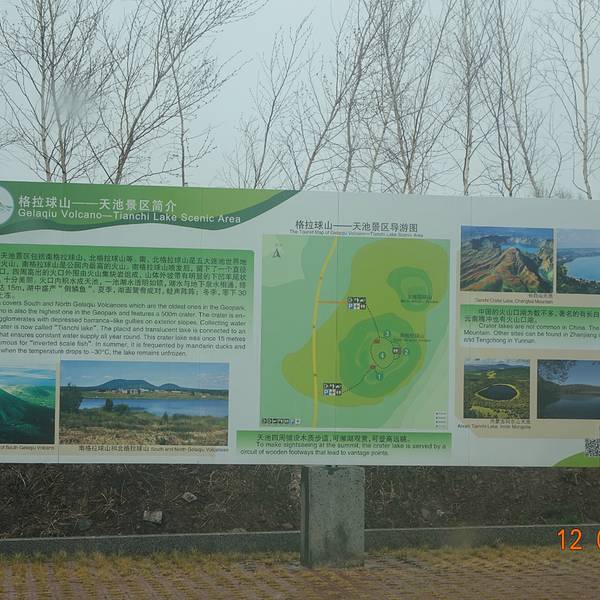 2、很远的景点,一定要乘车,步行没戏。格拉球山天池简介。可是这黑乎乎的东西好像在移动?一路向上不知从什么时候起,天气预报越来越准,雨如约而至。看着雨不大,我们也如期向天池进发。格拉球山是五大连池里喷发最早的火山,200多万年来,南格拉球火山口内长年积水形成了世界上最精巧的火山“天池盆景”。天池...不知从什么时候起,天气预报越来越准,雨如约而至。看着雨不大,我们也如期向天池进发。格拉球山是五大连池里喷发最早的火山,200多万年来,南格拉球火山口内长年积水形成了世界上最精巧的火山“天池盆景”。天池和老黑山是一个方向,路上还会经过大庆油田农场,可以看到一些没见过的大型机械化设备在田间作业。正当我们好奇的东张西望时,突然发现远处有一个巨型黑门框,由于车高的原因,只要看见门框似的东西,我的第一反映就是能不能过?可是这黑乎乎的东西好像在移动?是的它在动,它来了,一个外形不逊于变形金刚的特种车辆。与怪车擦身而过后,我们来到了疑似的景区,绕过入口处的狼籍,施工人员告诉我们,平时车是可以上去的,不过今天雨大路滑,小车肯定是不行,我们的车也够呛。爱车,不要负我呀,当初换你,就是为了今天,Let’s go!
