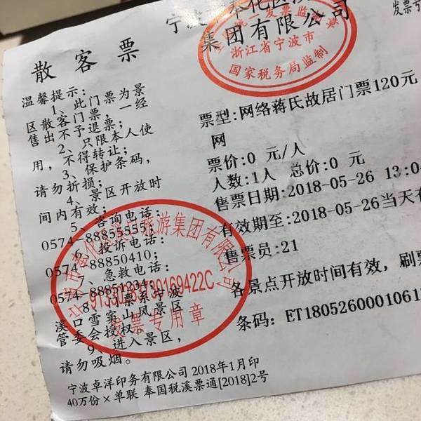 特别提示:前五个小景点散布在沿河的一条老街中,不想进去的话就不必买票,沿老街转转即可附上网上订票后取到的纸质票照片两张,我因时间有限,只买了蒋氏故居景区的票120元(用了优惠卷实付110),对应蓝色字体序号1-7共7个小景点,从下午2:15到5:00,转完了5个,第5个博物馆正在维修、看不了;我们是...附上网上订票后取到的纸质票照片两张,我因时间有限,只买了蒋氏故居景区的票120元(用了优惠卷实付110),对应蓝色字体序号1-7共7个小景点,从下午2:15到5:00,转完了5个,第5个博物馆正在维修、看不了;我们是步行从5走到6蒋母墓地去的,墓地在村外的山上,走过去用了半小时,主路到墓全是上山台阶,天阴着、路面青苔有点湿滑,走一段才到进口,20多分钟就出来了,彻底理解了母凭子贵的道理;第7杜鹃谷据说还有2km,我没时间去、就放弃了。特别提示:前五个小景点散布在沿河的一条老街中,不想进去的话就不必买票,沿老街转转即可。雪窦山景区是另一个景点,攻略上看需要大半天时间,等以后有机会再来吧-。