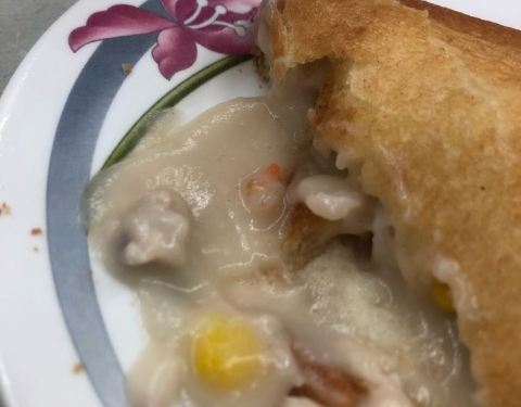 简单来说棺材板就是厚片吐司里面加上类似于玉米浓汤的馅料。这个馅料通常包含了新鲜的鸡肉 块、蔬菜和新鲜的墨鱼加上炸的酥透的厚片吐司。