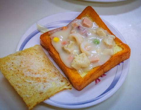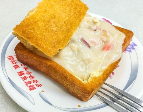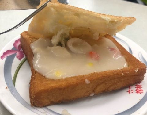 棺材板是台南的特色小吃,外面的厚吐司感觉有点像厚多士,里面的馅料丰富有层次感
