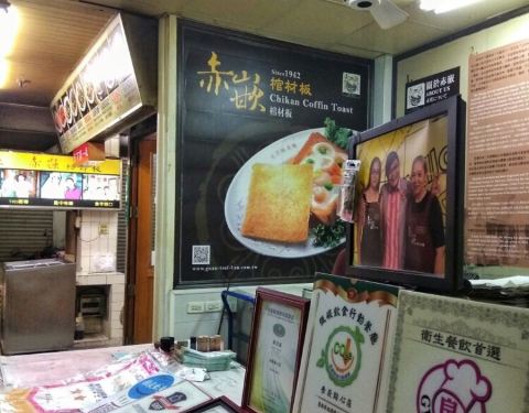 这家是台南必吃小吃棺材板的创始店。棺材板的做法是中西合并式,用炸酥的厚片吐司作容器,里面装上香气十足…