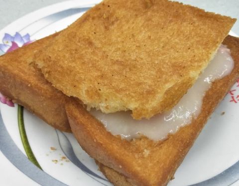 在更多地方叫官财板,取升官发财之意,就是厚片吐司切开填上馅料炸酥,好吃哦