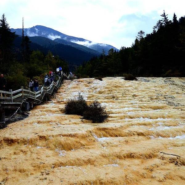 奔涌的水流从堤埂上翻越而下,在钙华壁上跌宕成一道金碧辉煌的钙华瀑布,十分壮观洗身洞距涪源桥1273米,处在黄龙沟的第二级台阶上。从金沙滩下泻的钙华流,在这里突然塌陷,跌落成一堵高10米,宽40米的钙华塌陷壁,它是目前世界最长的钙华塌陷壁。奔涌的水流从堤埂上翻越而下,在钙华壁上跌宕...洗身洞距涪源桥1273米,处在黄龙沟的第二级台阶上。从金沙滩下泻的钙华流,在这里突然塌陷,跌落成一堵高10米,宽40米的钙华塌陷壁,它是目前世界最长的钙华塌陷壁。奔涌的水流从堤埂上翻越而下,在钙华壁上跌宕成一道金碧辉煌的钙华瀑布,十分壮观。洗身洞就位于钙华瀑布下部。 展开