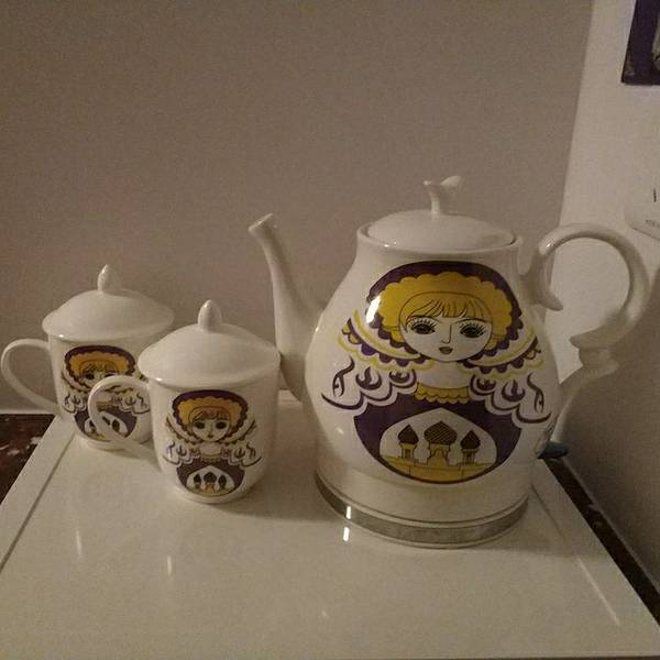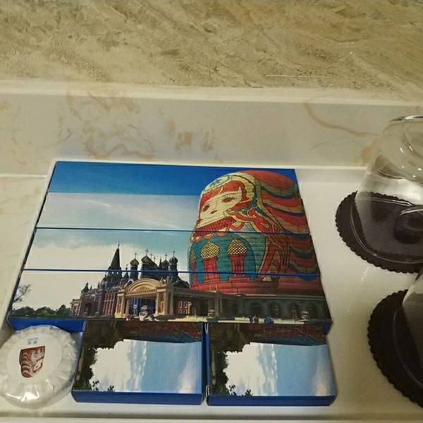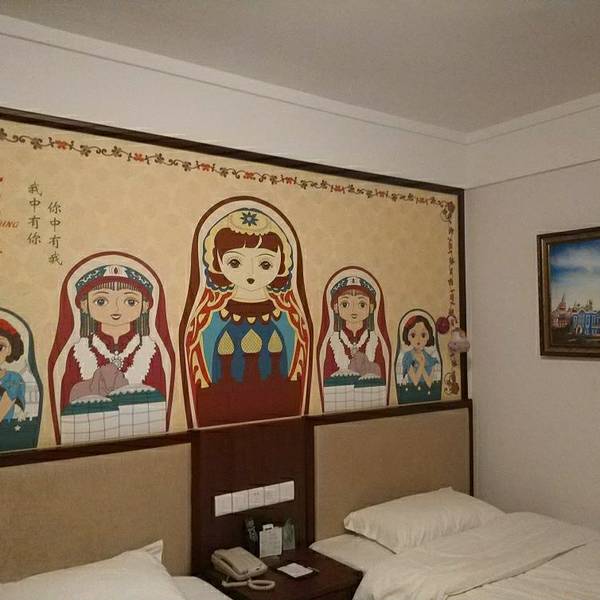 我们住的是三号楼,属于副楼,和一号楼的豪华程度是没法比的,房间设施很简朴,但是套娃元素也是满眼皆是。从电水壶、靠枕、床头壁画到电视背景墙,再到洗漱用品,几乎没有一眼看不到套娃的地方,可见酒店布置之用心。