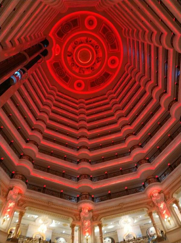进入大堂一看,富丽堂皇,豪华得很,壁纸、壁画、吊灯、瓷砖、走廊、穹顶…到处都是金光灿灿的,满眼都是套娃元素,果然是五星级酒店啊,光看大堂就值回票价了,难怪有这么多旅行团带旅客来参观呢。
