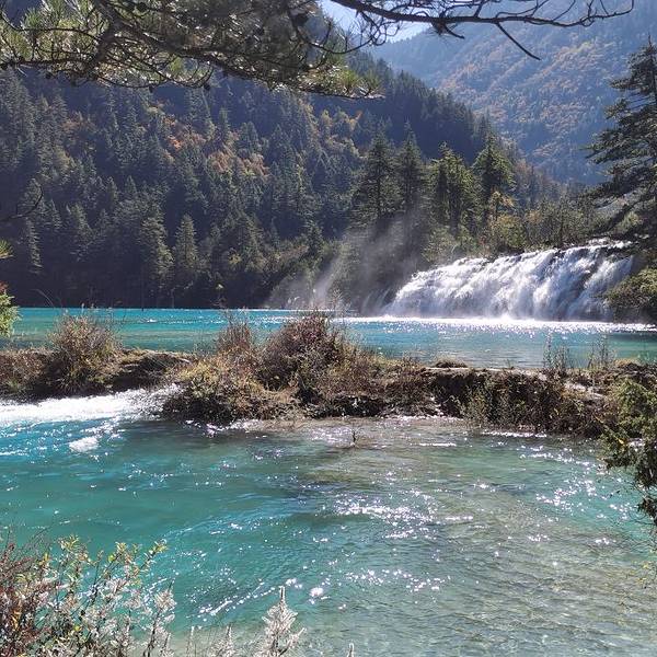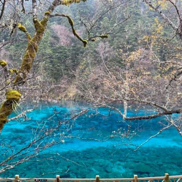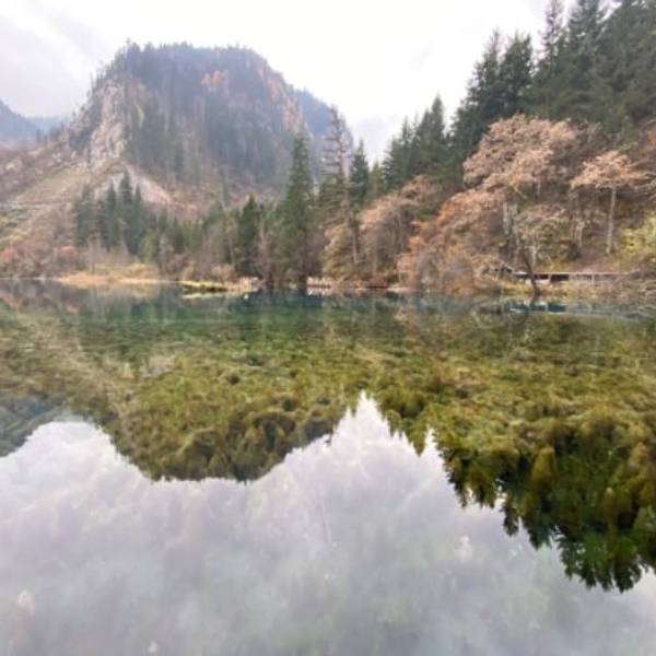 五彩池位于则查洼沟南段,是九寨沟尤为艳丽的池子,且四季不冻。其以秀美多彩纯净通透而闻名,因水中富含碳酸钙,所以湖水光影斑驳。有阳光的时候时是拍摄的好时机,在不同的位置和角度,会呈现出不同的色彩。 五彩池的水来自高处的长海,水中生长着水绵、轮藻、小蕨等水生植物群落,还生长有芦苇、节节草、水灯芯等草本植物。这些植物所含叶绿素深浅不同,在富含碳酸钙质的湖水里,就呈现出不同的颜色,使得五彩池上半部呈碧蓝色,下半部则呈橙红色,左边呈天蓝色,右边则呈橄榄绿色,颜色五彩斑斓,池水清澈通透,透过水面,能清晰的看到池底岩石的纹路,在阳光的照耀下,闪耀着五彩的光芒。 如今九寨沟风景区重开,这里也成为了观赏秋景的好去处。