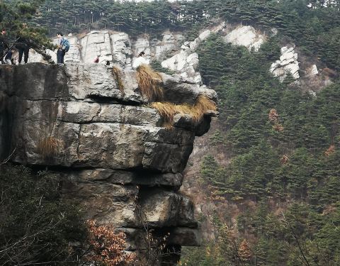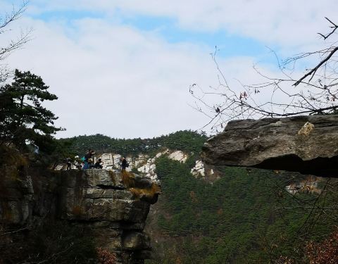 凌空巨石于深涧上游底部,利用视差与远处悬崖,可拍得一张惊险的“天桥留影”。