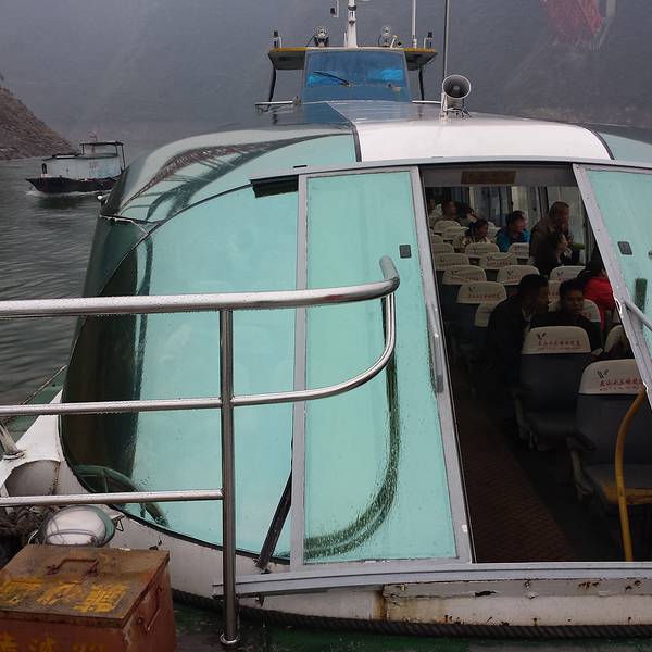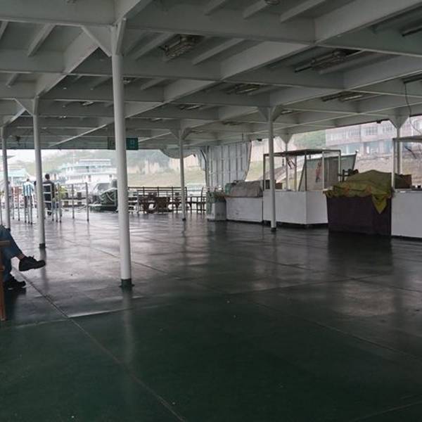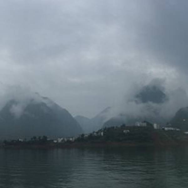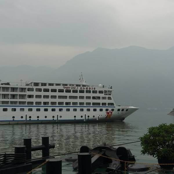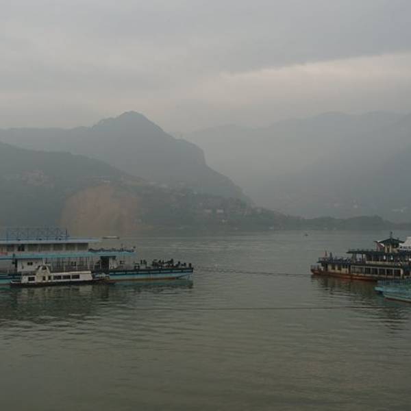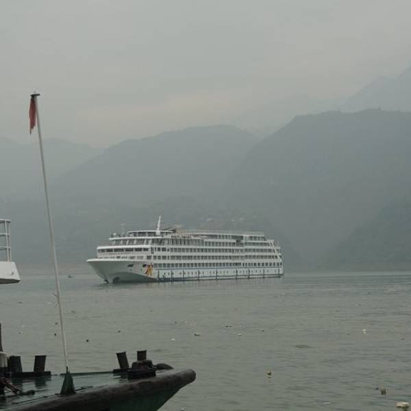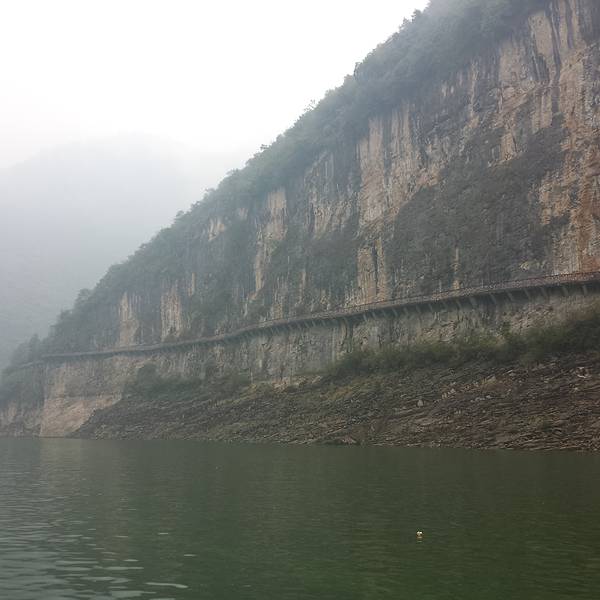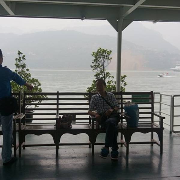 9月28日,我们一家人七点半就整装出发来到江边,雨已经停了,看着远处的云层,我们还是带上了事先准备好的雨衣。估算游船时间大概四个半小时,又带上头天在兴平买的张烤鸭、面包、零食、水果。买船票游小三峡,船票150一人,老爸七十岁以上票价115元。由于不是假期码头上游客不多。等船时有两艘庞大的游轮靠岸,游轮尾部排出的汽雾有重重地油味。远望巫山县城……给老爸在巫山留下属于我们的记忆……不知不觉等了近一个小时,我们乘坐的“小三峡号”来了。一层船舱已经被一个旅行团包了,几乎没有座位。二楼茶座30元/人,上去看时,已经没有座位,与船家商议在船头放几张凳子算加座。