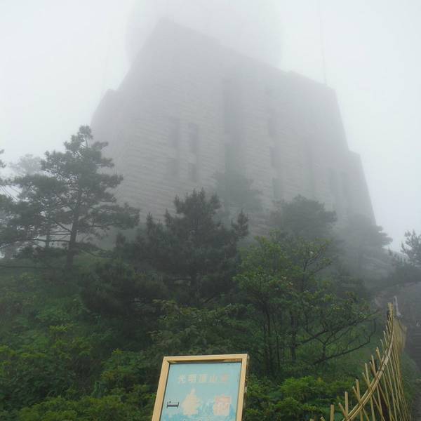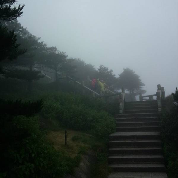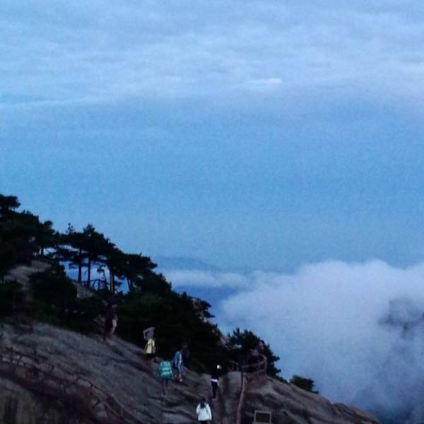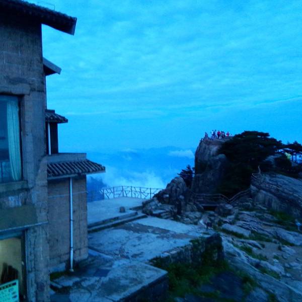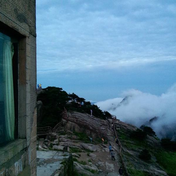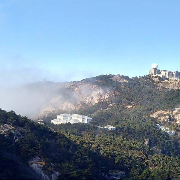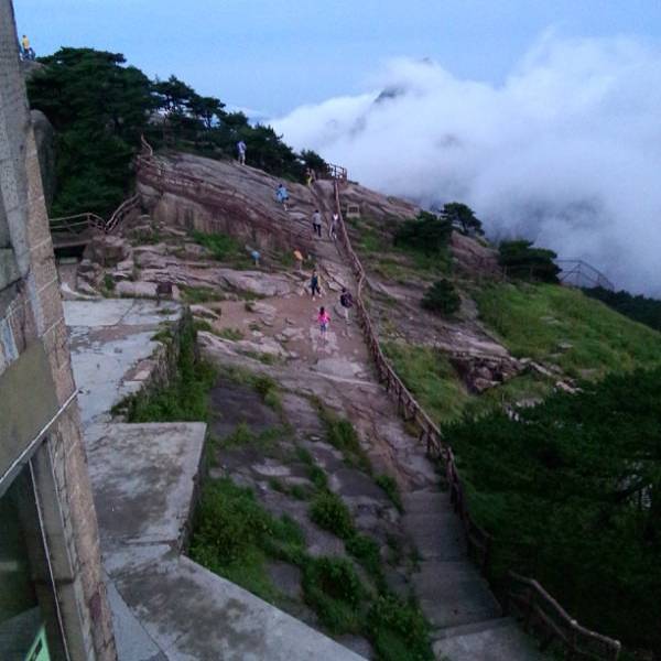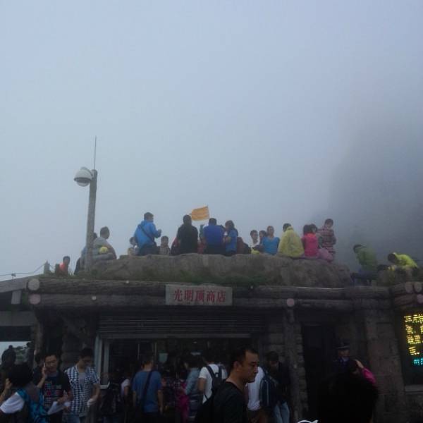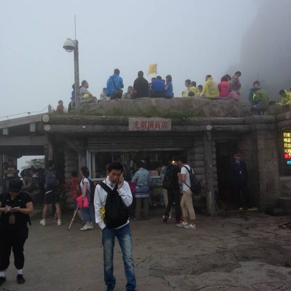然后,光明顶的气象台会有播报天气和日出时间。第二天的日出时间好像是5点吧,不过天气是多云,也就是说看到日出的几率变得很小了。但是还是不死心想看看日出。但是这就意味着我们要第二天3点就起床,打着手电筒走山路从西海赶到光明顶(- -听说很恐怖的,晚上打电灯走山路经常会照到一些影子,呃,可能是塑料皮,也有可能是猴子。。总之想想还是怪吓人的),后来就添了钱住在了光明顶的宾馆里。好像是6个人住一间,不过还好有洗澡的,可以休整一下(爬山爬的满身是汗)。