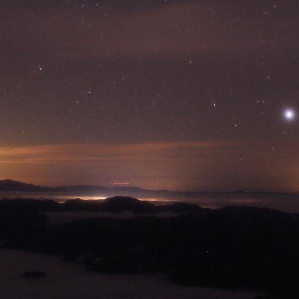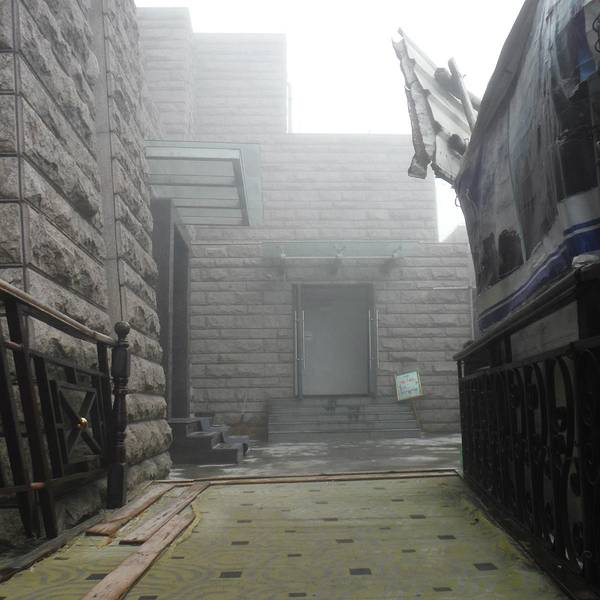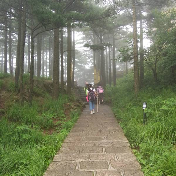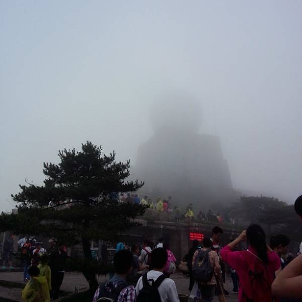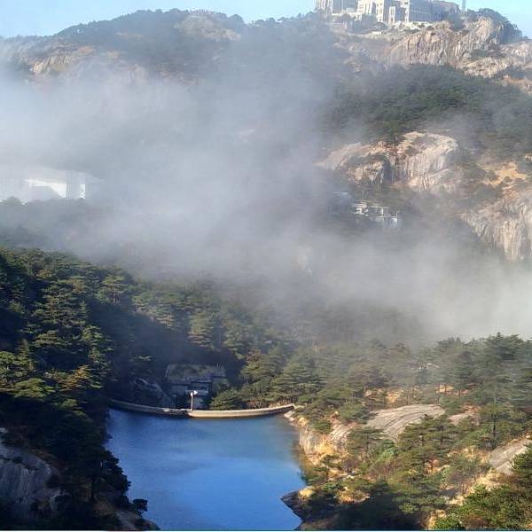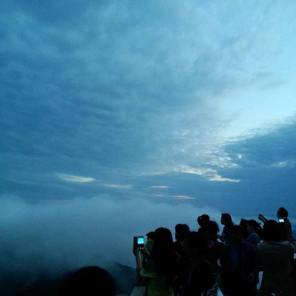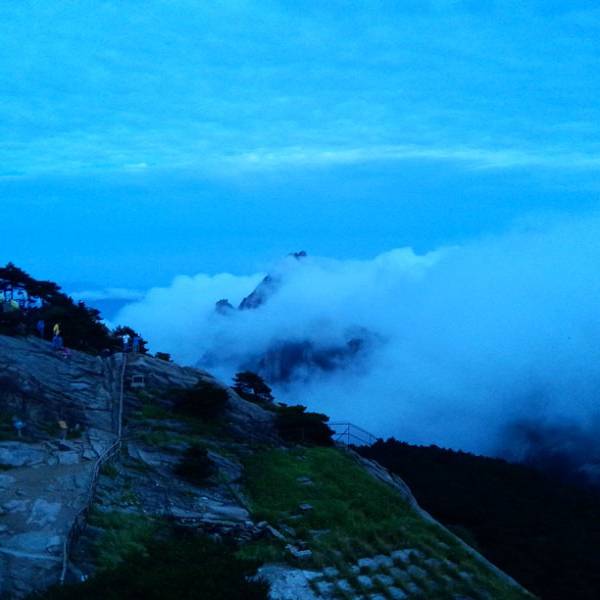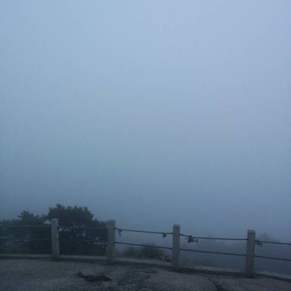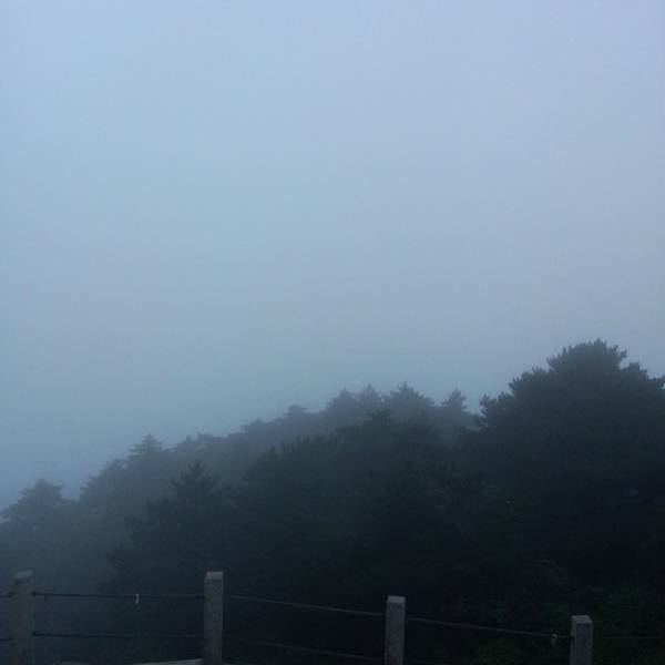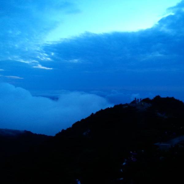 然后,光明顶的气象台会有播报天气和日出时间。第二天的日出时间好像是5点吧,不过天气是多云,也就是说看到日出的几率变得很小了。但是还是不死心想看看日出。但是这就意味着我们要第二天3点就起床,打着手电筒走山路从西海赶到光明顶(- -听说很恐怖的,晚上打电灯走山路经常会照到一些影子,呃,可能是塑料皮,也有可能是猴子。。总之想想还是怪吓人的),后来就添了钱住在了光明顶的宾馆里。好像是6个人住一间,不过还好有洗澡的,可以休整一下(爬山爬的满身是汗)。