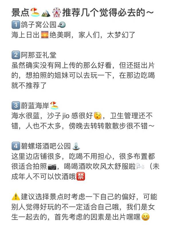 ⚠️选择景点时考虑一下偏好,别人觉得好玩的不一定适合自己哦,我们是女生一起去的,先考虑的就是出片~