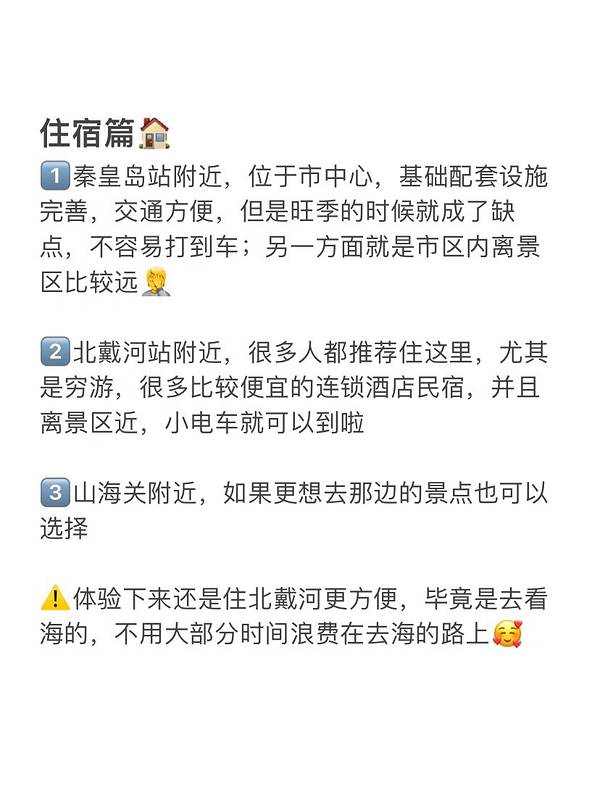 住宿方面,北戴河选择多样:从文艺民宿到海景酒店,应有尽有。建议选择近海区域,推开窗便是涛声与晨曦。交通也极为便利,高铁直达“北戴河站”,出站后公交或打车即可抵达景区。