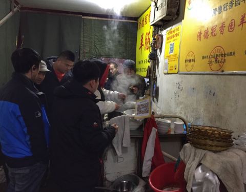 那些深夜觅食的年轻人(二) 吃了顿不如意的野羊肠子,想来,也只有冠香园算作是“有店面”吧? 来了多次,只有这次遇上了这么多深夜觅食的年轻人,大家围在老板旁边,耐心等着属于自己的那一碗。 “老板,一碗肥的,一个饼。” “老板,一个大碗,多要点肥的。” 随意找地儿坐,但是大家还是更爱站着,这可能就是羊肠子本身的仪式感,听朋友说,小时候放了学,那是还没写店面,大家就围着三轮车站着吃一碗冒着热气儿的羊肠子,吃完去自习,一晚上肚子里都暖暖和和。 冠香园算是比较知名的一家,深夜食客络绎不绝,每个人都有自己固定的点儿和“老样子”…… 比起随便在十字路口吃的野羊肠子,冠香园没那么重的味精味儿,汤更清纯,羊肠更饱满,人嘛,也最多……