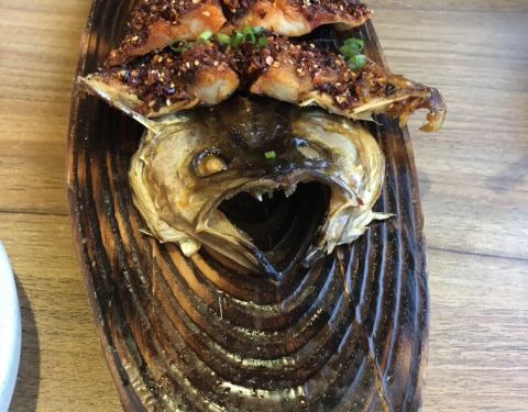 住在边上的希尔顿欢鹏,到了吉林必须体验一下当地的鲜族餐。发现了这家连锁店,服务不错,菜品是结合了朝鲜菜和川菜特色,三个人点了烤明太鱼、海鲜炒饭、水煮牛肉、海鲜豆腐和朝鲜打糕烤明太鱼偏干,推荐海鲜铁...